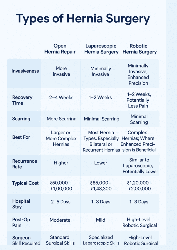 For larger or complex hernias, traditional open repair may be recommended. Though it involves a slightly longer recovery time, it remains highly effective when performed by an experienced surgeon.